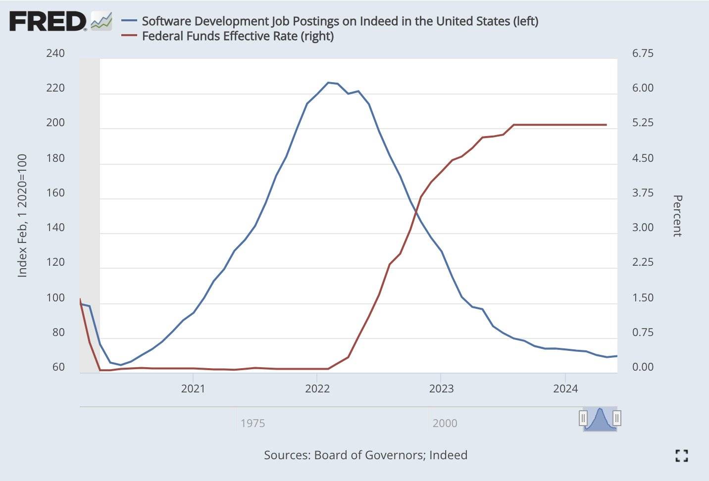 The leftmost is the beginning of 2020, and the gray indicates recession. The blue line is the software development job posting on Indeed in the US (Jan 2020=100), and the red line is the federal fund's effective rate. Take this graph a look again after watching my video: